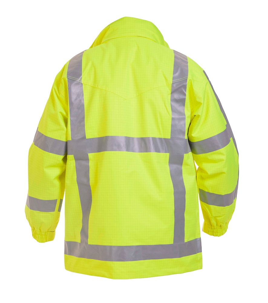 Concealed zip front with double storm flap cover and press stud closure Hood in collar with draw cord Hood with innovative fixture for improved hearing through hood Napoleon pocket Inner pocket 2 front pockets with flap 2 side pockets Adjustable cuffs using hook and loop fastening Flame retardant and anti-static Multi Simply no Sweat (SNS) 260gsm Polyester 99% / 1% Anti-static 100% FR Cotton lining Highly breathable providing great comfort Durable and cost effective Smooth textile finish Conforms to the following standards: EN1149-5:2008 Anti Static- Material Performance and design requirement EN ISO 14116:2008 Protection against limited spread Outer material Index 1/12H/60 Inner material Index 3/5H/60 EN ISO 20471:2013 Class 3 High visibility EN343:2003 + A1:2007 Class 3:3 Protection against rain EN 13034:2005+A1:2009 Protection against liquid chemicals (Type 6) EN ISO 13688:2013 General requirements for protective clothing