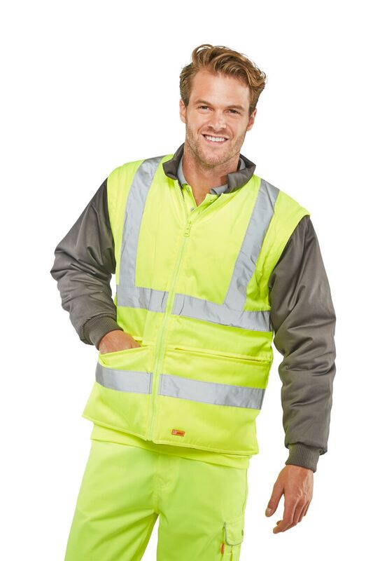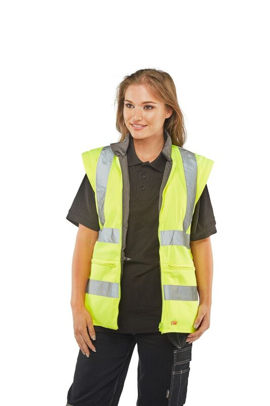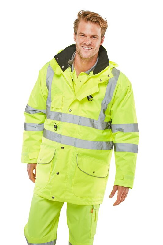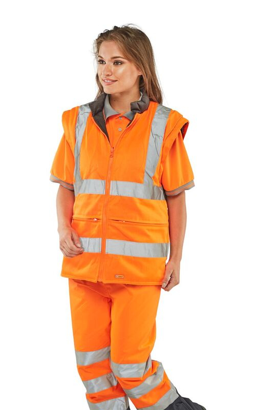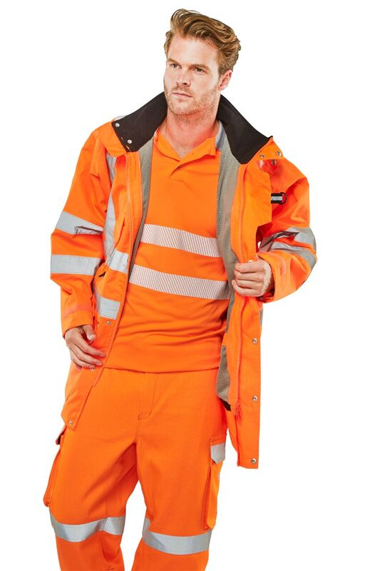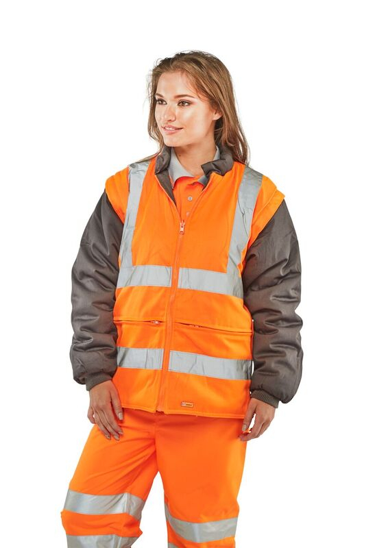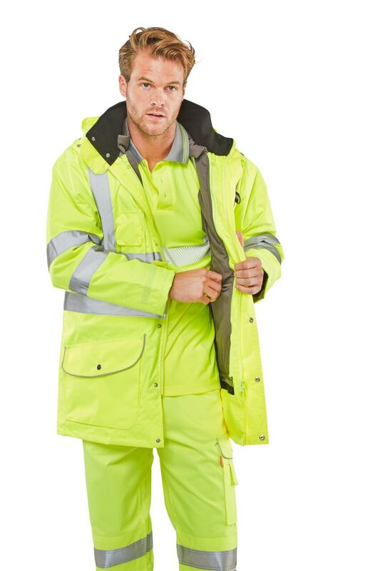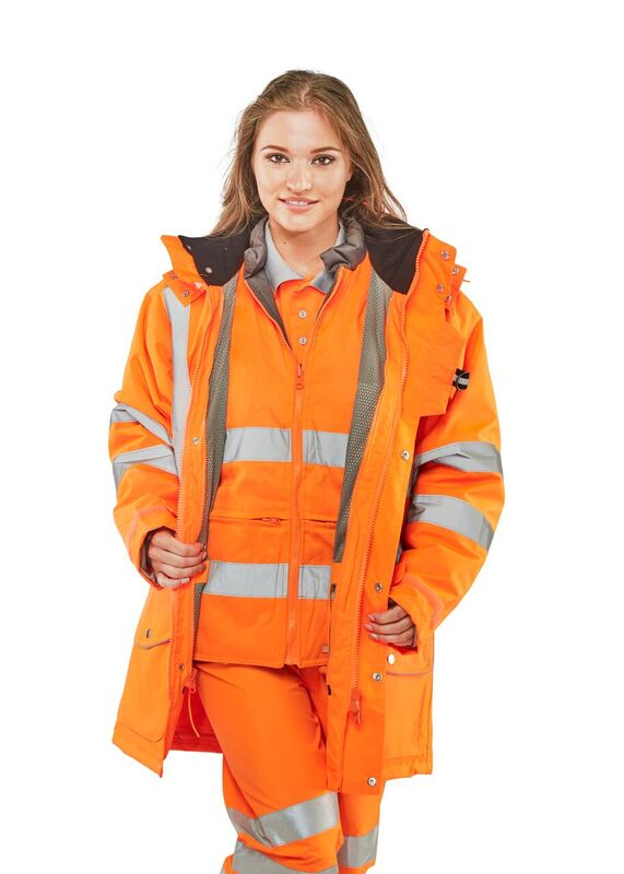 Highly versatile garment Suitable for "All Seasons" use Breathable outer shell. Removable hood. External phone pocket. D rings for attaching identity tags. Fleece lined collar on outer garment. Velcro adjustable cuffs. Hand warmer pockets. Inner jacket zipout sleeves. Retro-reflective tape. Conforms to EN ISO 20471 Class 3, GO/RT 3279 and EN343. GO/RT 3279 applies to Orange only.