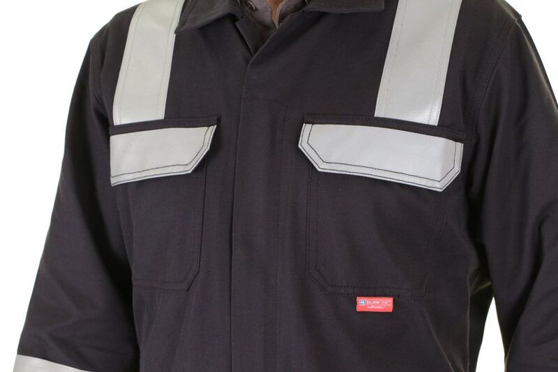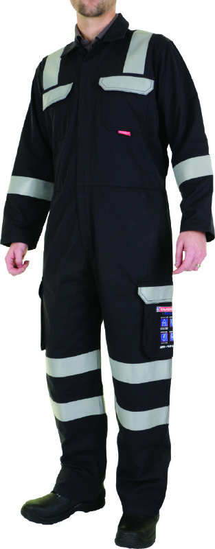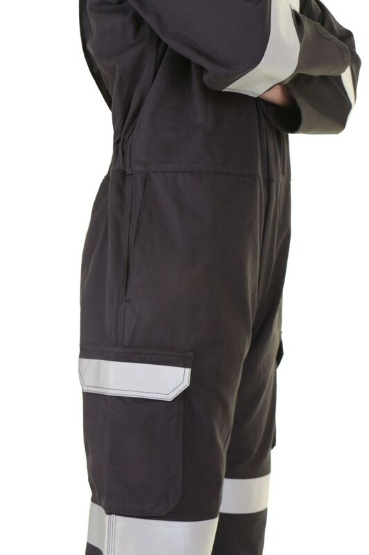 Fire retardant, Anti-static, ARC Flash coverall. 300gsm 60/40 Modacrylic/cotton blend. Triple stitch construction. 2 hip pockets. Rear patch pocket with Velcro closure flap. Large bellows pocket to each leg with Velcro closure flap. Right leg mobile phone pocket with Velcro closure flap. All pocket flaps with Retro-reflective tape feature. Internal knee pad pouches. Large qualifying icons on left leg pocket.