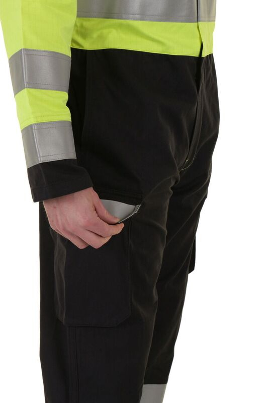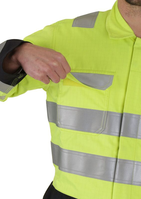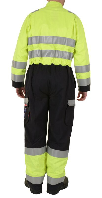 Fire Retardant, Hi Vis, Anti-static, ARC Flash two tone coverall. 300gsm 60/40 Modacrylic/cotton blend. Triple stitch construction. 2 hip pockets. Large bellows pocket to each leg with Velcro closure flap. Right leg mobile phone pocket with Velcro closure flap. All pocket flaps with Retro-reflective tape feature. Internal knee pad pouches. Large qualifying icons on left leg pocket.