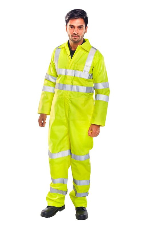 Multi purpose 'utilties' boilersuit Fire Retardant Anti Static 320gsm fabric 80% Cotton 19% Polyester 1% anti static 2 Vertical side access hip pockets High visibility 1 left breast pocket with sewn down flap Concealed stud fly front to neck Plain back Internal knee pouch pockets Elastic to waist Plain cuffs and ankles Retro-reflective tape FR/AS embroidery to left sleeve